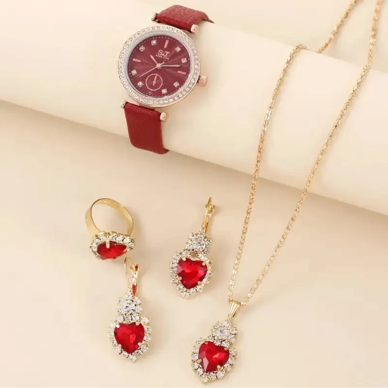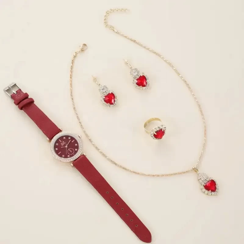 লাল রং এর চারটি গয়না এবং ঘড়ির সেট। এটিতে একটি সুন্দর কারুকাজ করা ঘড়ি রয়েছে, একটি নেকলেস, কানের দুল এবং একটি আংটি৷ , যা একটি দুর্দান্ত বাক্সে উপস্থাপিত। বিশেষ অনুষ্ঠানের জন্য বা একটি মূল্যবান উপহার হিসাবে উপযুক্ত এটি।