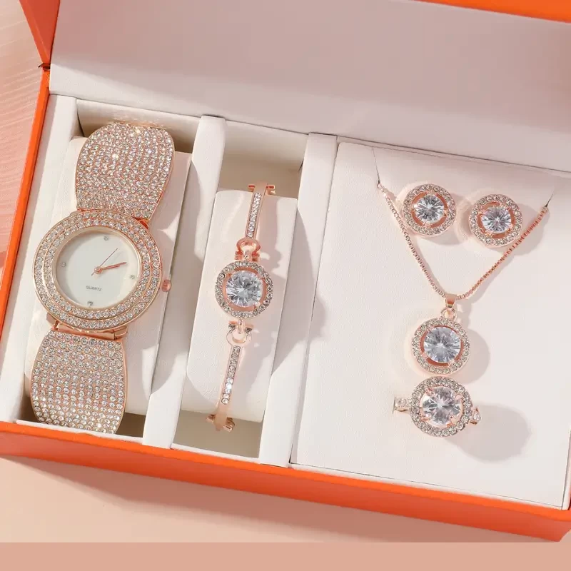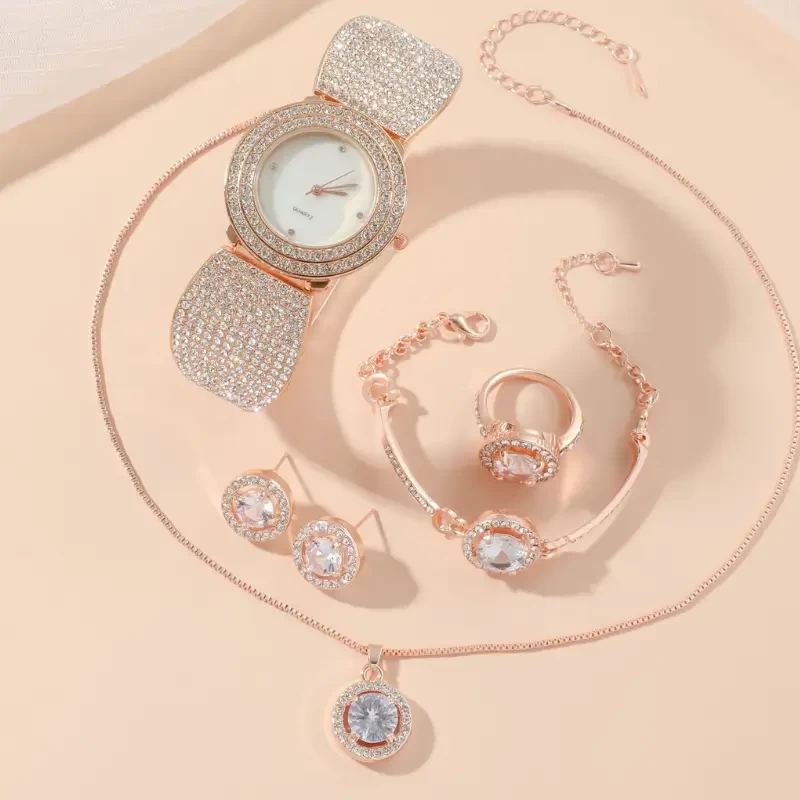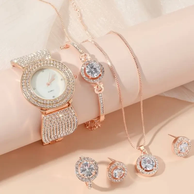 Quartz Watch & Jewelry Set for Women 6 Piece Luxury Gift Set is a perfect blend of elegance and style. It includes a precision quartz watch and matching jewelry pieces like necklaces, bracelets, earrings, and rings, crafted from high-quality materials. Ideal for special occasions, this set is a symbol of luxury and timeless beauty.